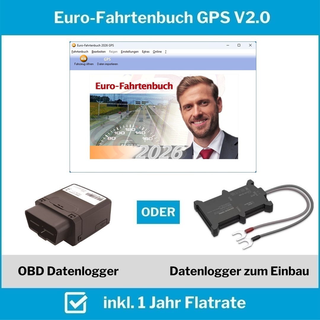 Das Komplettpaket enthält einen betriebsbereit konfigurierten GPS-Datenlogger mit aktivierter Mobilfunkkarte. Außerdem enthalten ist die aktuelle Euro-Fahrtenbuch Software für Windows und der Zugang zum Server für die Georeferenzierung der Start- und Zielorte sowie zur Anzeige der Fahrten auf Straßenkarten.